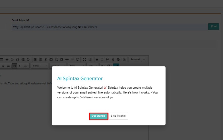 • Click on the “AI Spintax Generator” button (represented by a @ symbol) next to your subject line field.