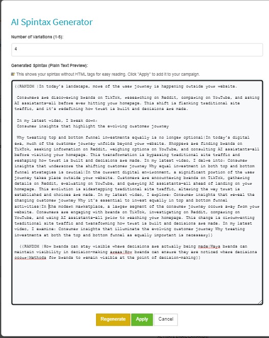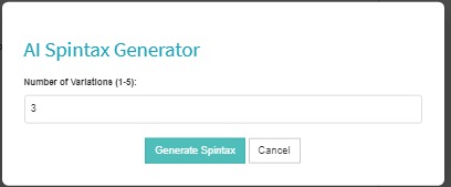 • Similar to the subject line tool, a pop-up will appear. Select your desired number of variations (you can generate up to 8 for the body content) and click “Generate Spintax”.