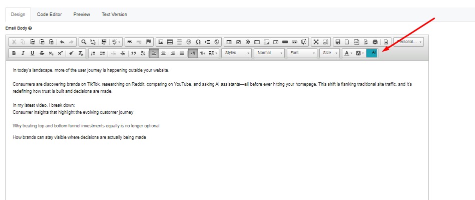 • For Email Body Content: Inside the “Code Editor” tab of the email design section.